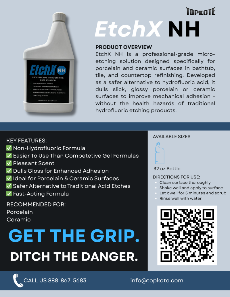 EtchX NH is a professional micro-etching solution designed specifically for porcelain and ceramic surfaces in bathtub, tile, and countertop refinishing. Developed as a safer alternative to hydrofluoric acid-based etches, EtchX NH delivers the surface dulling you want—without the health risks and handling concerns you don’t.