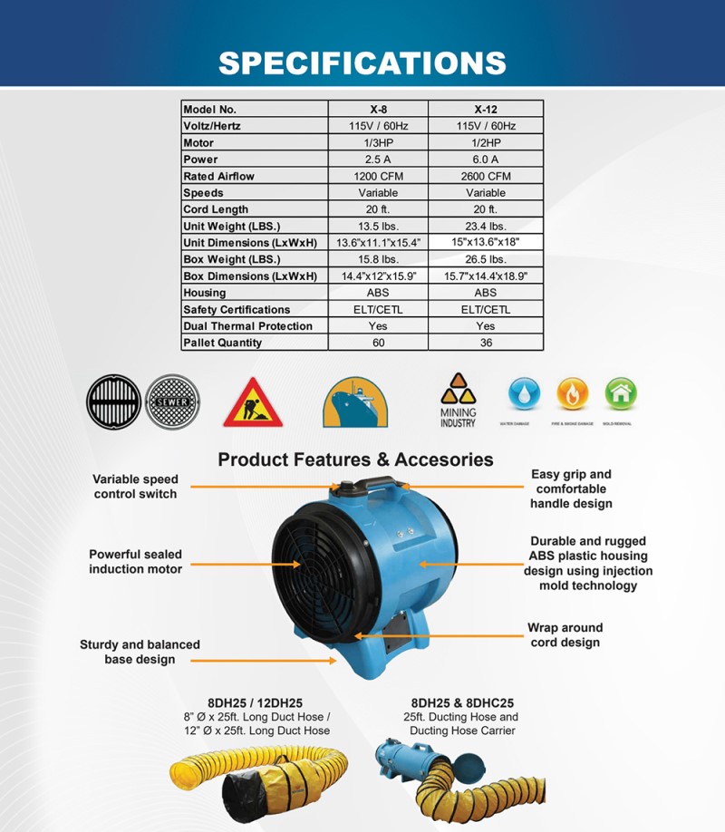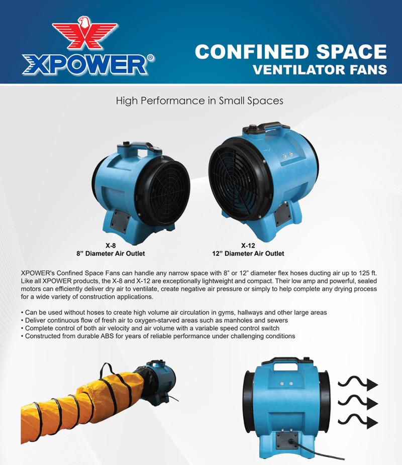The XPOWER X-8 and X-12 are industrial confined space ventilator fans with a variable speed control switch for optimal airflow. Featuring a low amp draw and performance plus induction sealed motor, both the X-8 and X-12 deliver dry air for ventilation, drying, or exhaust fan jobs. These units can be used to create negative air pressure and air circulation in bathrooms, kitchens, and other large areas. Ventilate any narrow space up to 125 ft. with the optional 8 inch or 12 inch diameter ducting hose (TK-8DH25 or TK-12DH25).